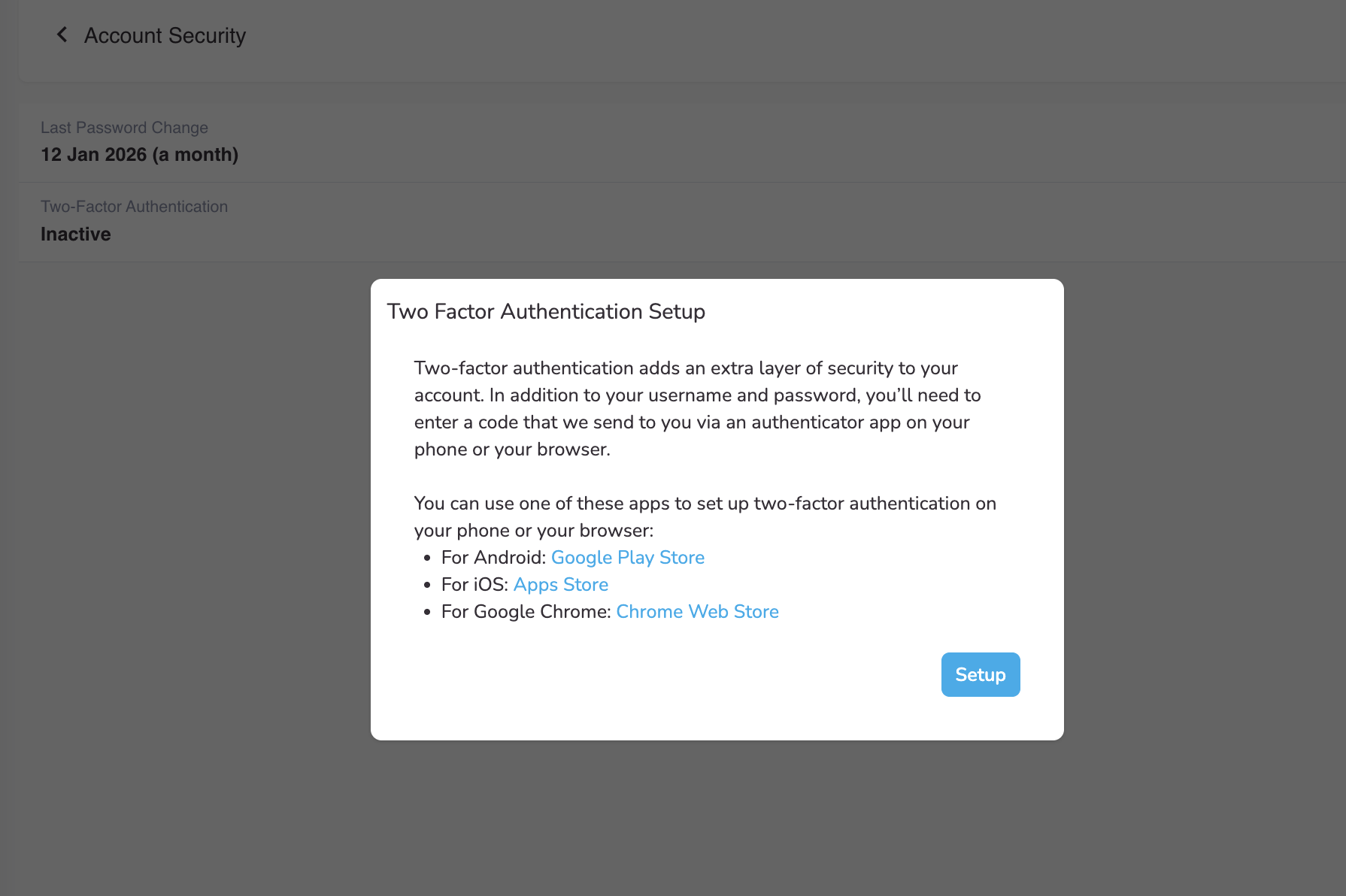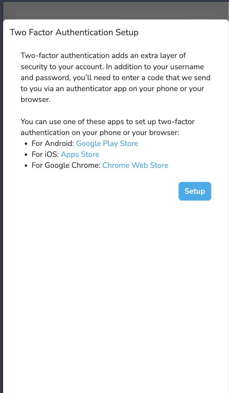 - In the Two Factor Authentication Setup section, click the SETUP button.