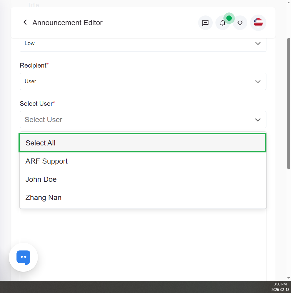 Announcement: Added ‘Select All’ option to the Recipient submenu in the Announcement Editor