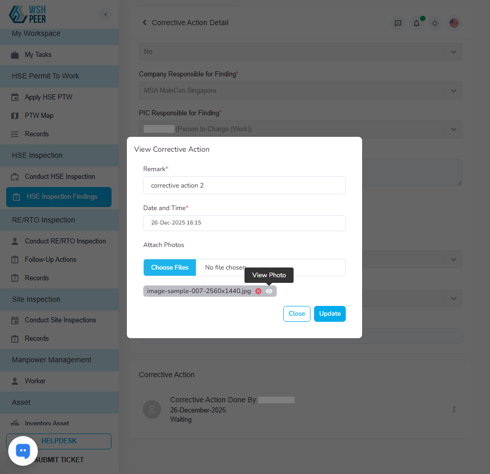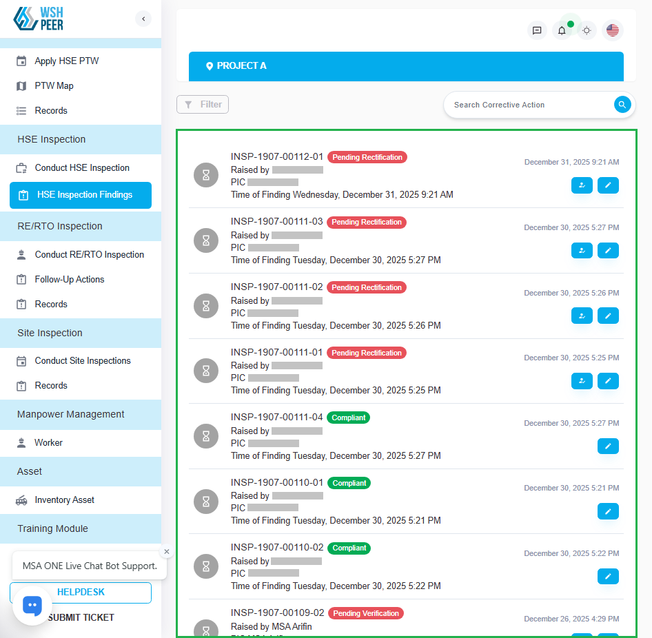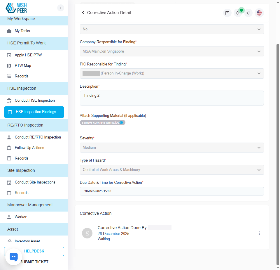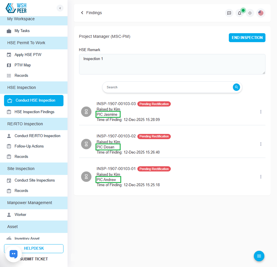 Added the PIC name to the findings list on the Conduct HSE Inspection page, allowing users identify the responsible PIC without opening the finding details.