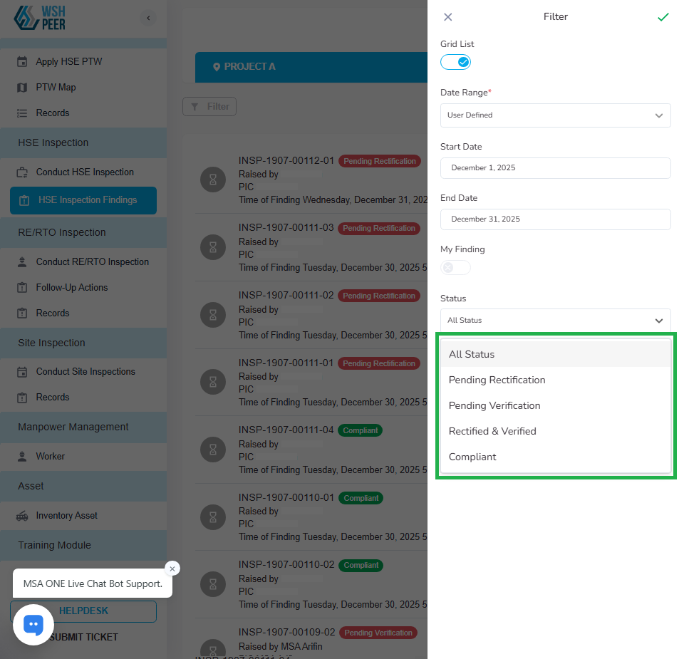 HSE Inspection Findings: Adjusted filter options list