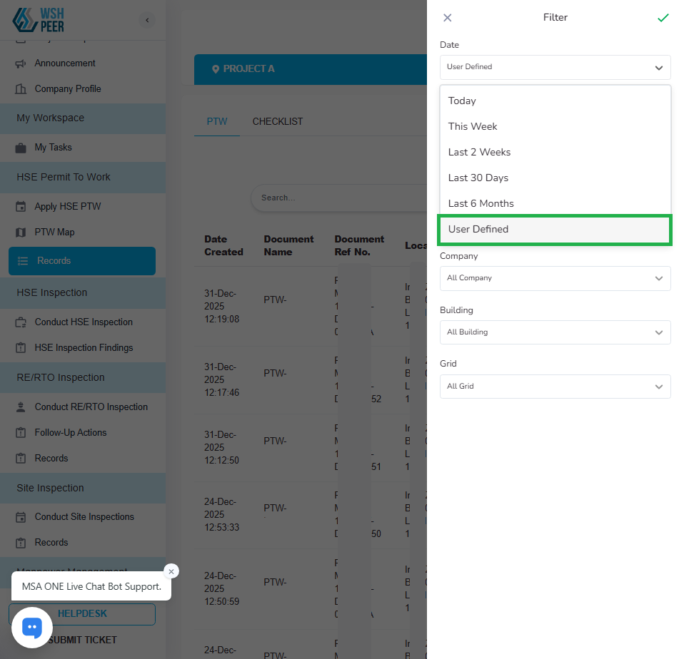 PTW: Fixed issue with the ‘User Defined’ date filter in PTW and Checklist Records
