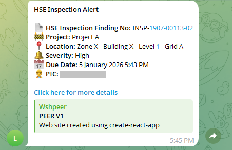 When the finding reaches its due date, a notification will be sent to the PIC via Telegram to remind them to perform the Corrective Action. A follow-up notification will be sent once if no Corrective Action has been taken.