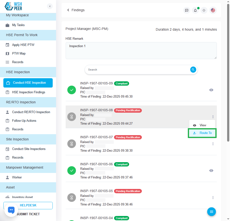 Added the ‘Route To’ feature in HSE Inspection, allowing Inspectors to change the PIC for each finding, with the following conditions: